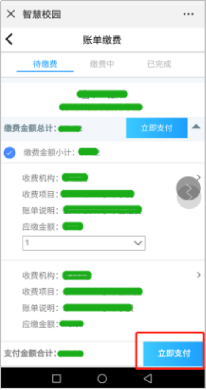 第四步:点击“账单缴费”,确认学生信息,点击“立即支付”->“提交”。