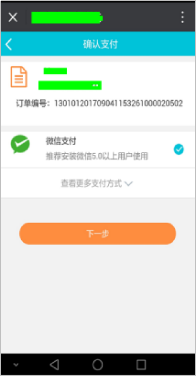 2、点击“微信支付”后请按流程完成支付,若中断支付,请半小时后在“待付款”继续支付